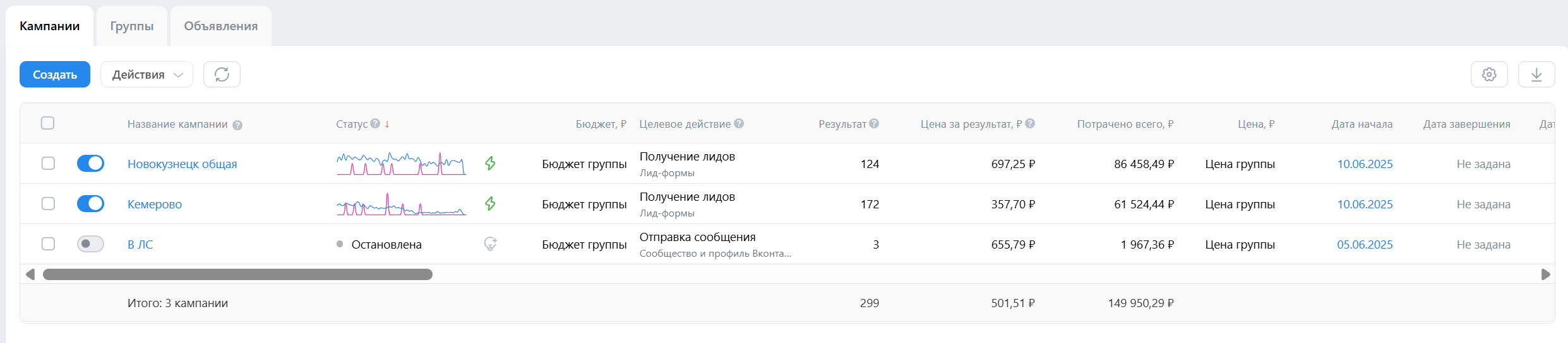 • Количество лидов в ВК: 110