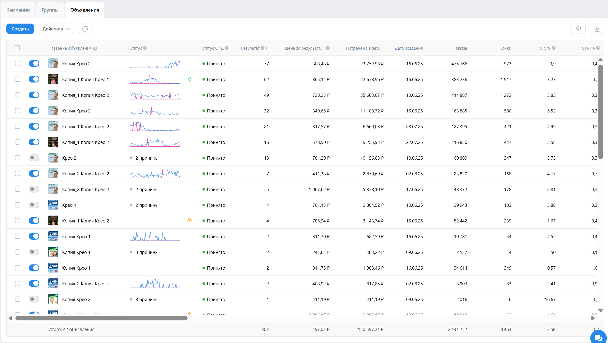 Скрины рекламного кабинета